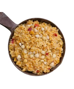Cómo prepararla: abre la bolsa, retira el absorbedor de oxígeno, agrega 300 – 350 ml agua hirviendo al envase, revuelve, espera 15 minutos y disfruta un plato de rica y abundante comida caliente directo del envase. No necesitas llevar olla: basta con una tetera pequeña para calentar agua, y además ahorras gas.
