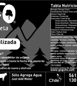 Es una alternativa de menú práctico, nutritivo (tiene carne de vaca) y rápida de preparar para trekking, montaña y otras salidas outdoor. Es alta en calorías, liviana de transportar y solo necesita agua para convertirse en un plato caliente, sabroso y abundante.