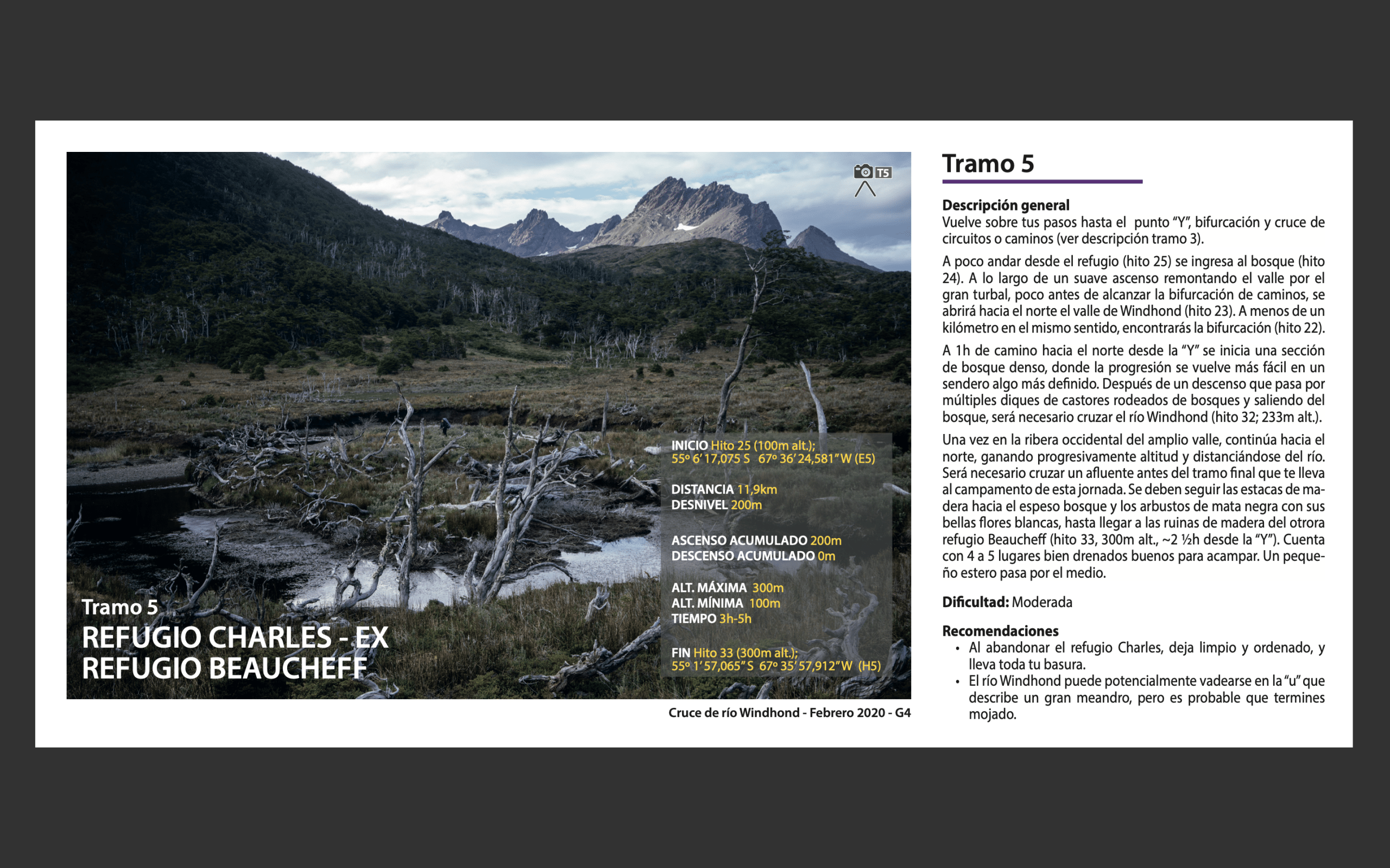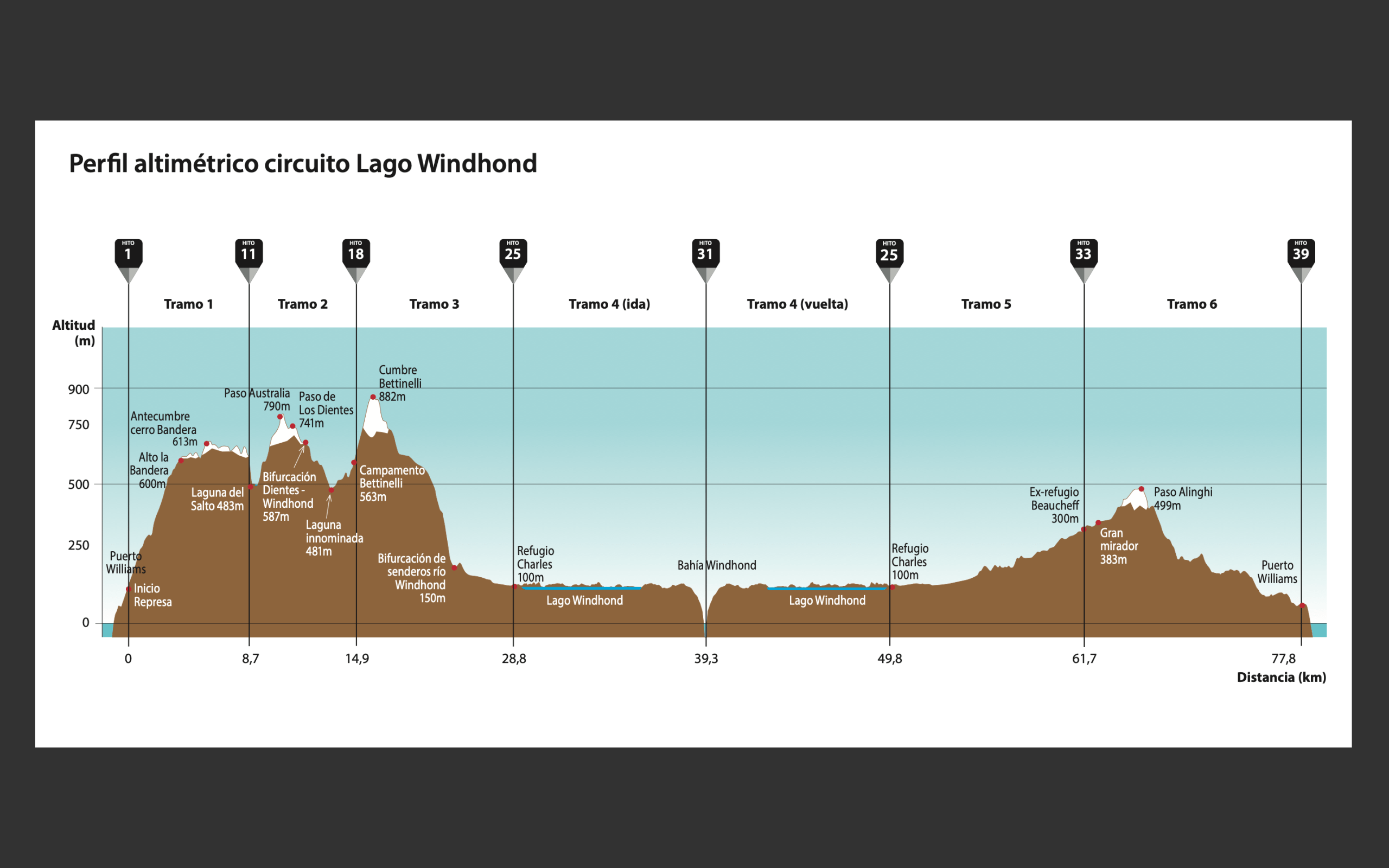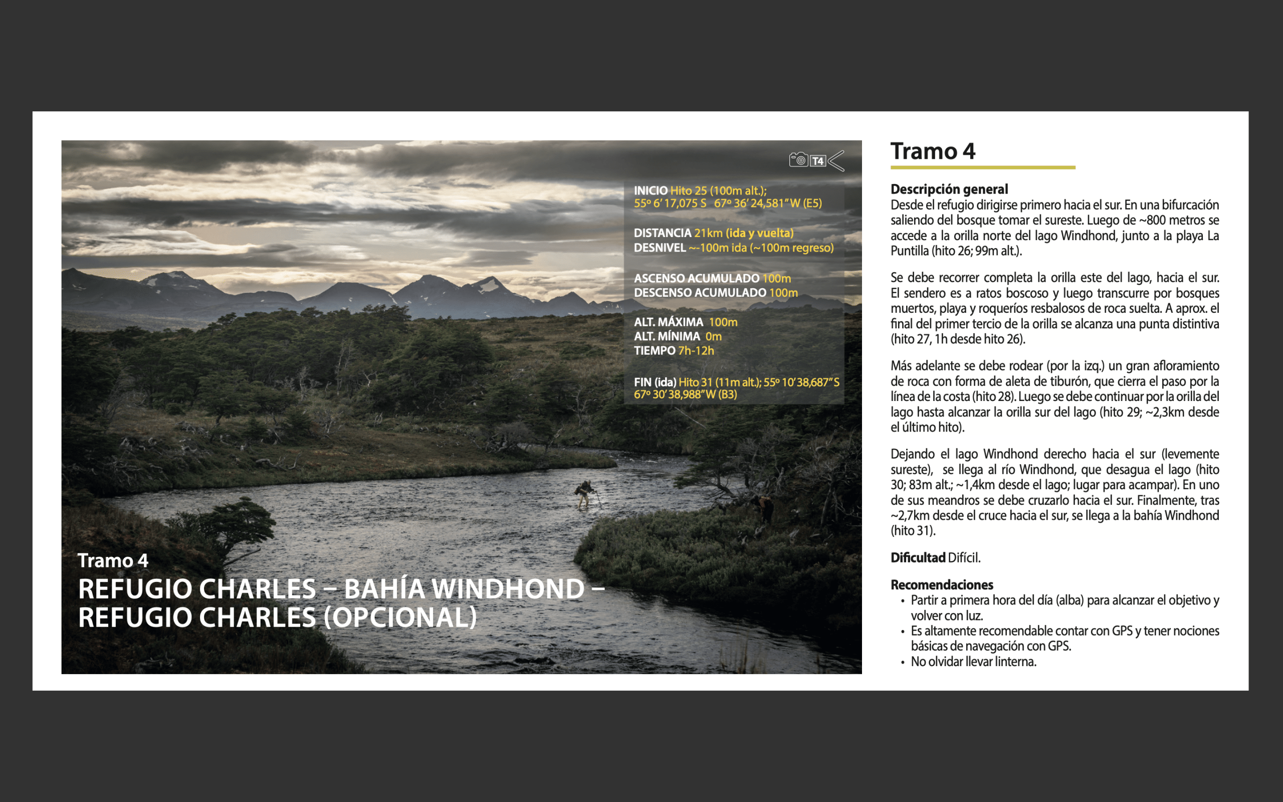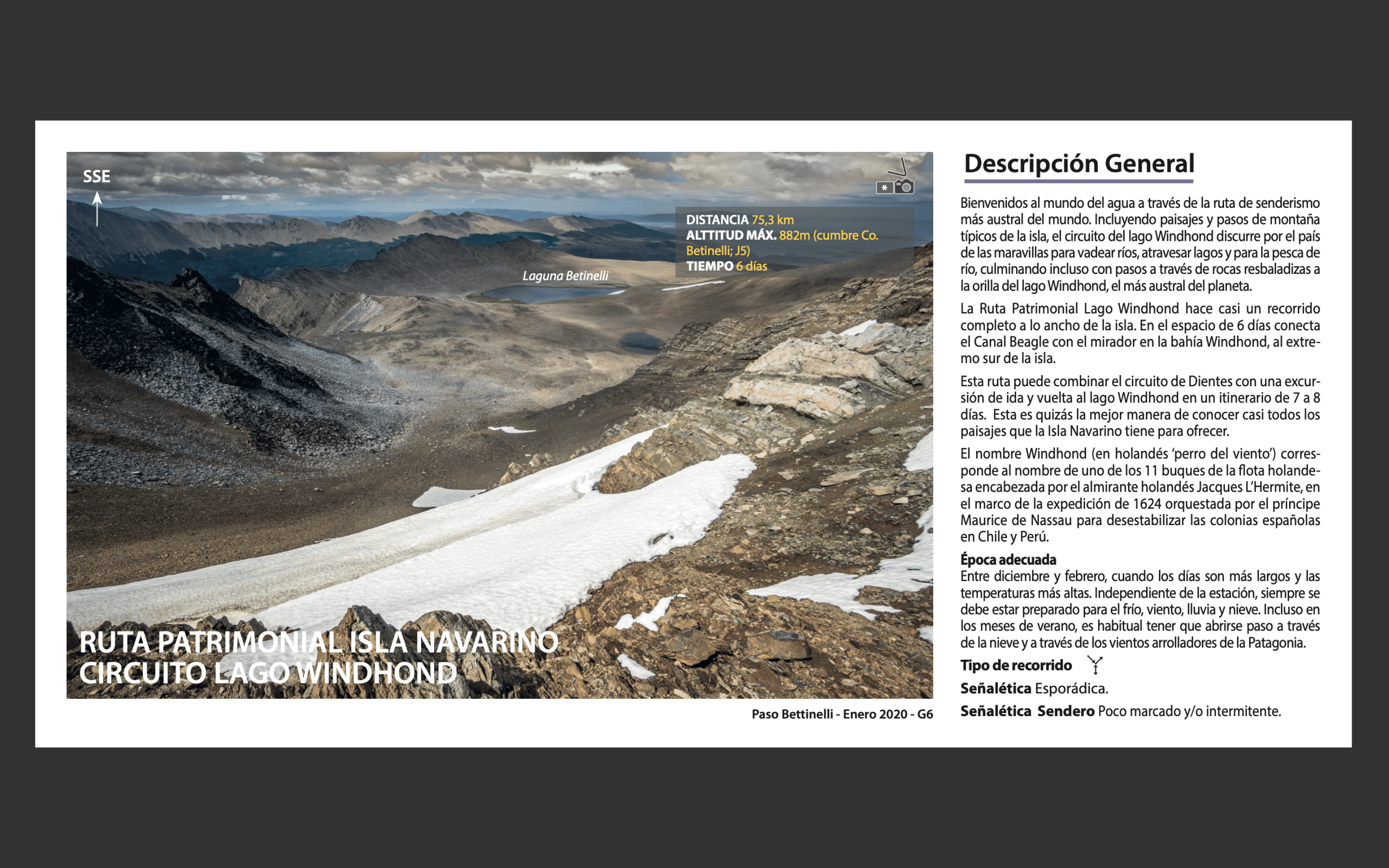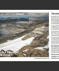 Esta carta topográfica escala 1:80.000 cubre con gran detalle el territorio de montaña donde se emplaza la Ruta Patrimonial Lago Windhond, en la Isla Navarino (Región de Magallanes). Cartografía elaborada por Andeshandbook, por encargo del Ministerio de Bienes Nacionales, como parte del programa Rutas Patrimoniales, publicada el año 2021.