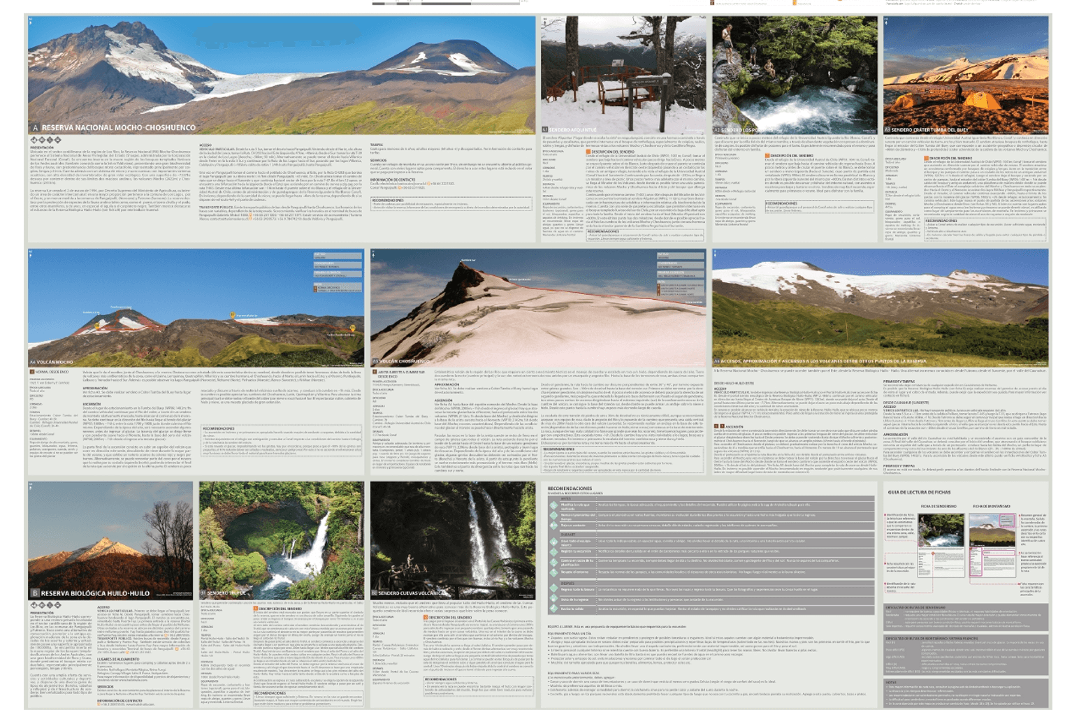 - Descripción de los senderos más importantes de cada área protegida, como Cráter Tumba del Buey, Afquintué, Los Pozones, Salto Truful y Cuevas Volcánicas además de las rutas de ascenso a los volcanes Mocho y Choshuenco por diferentes accesos y aproximaciones.